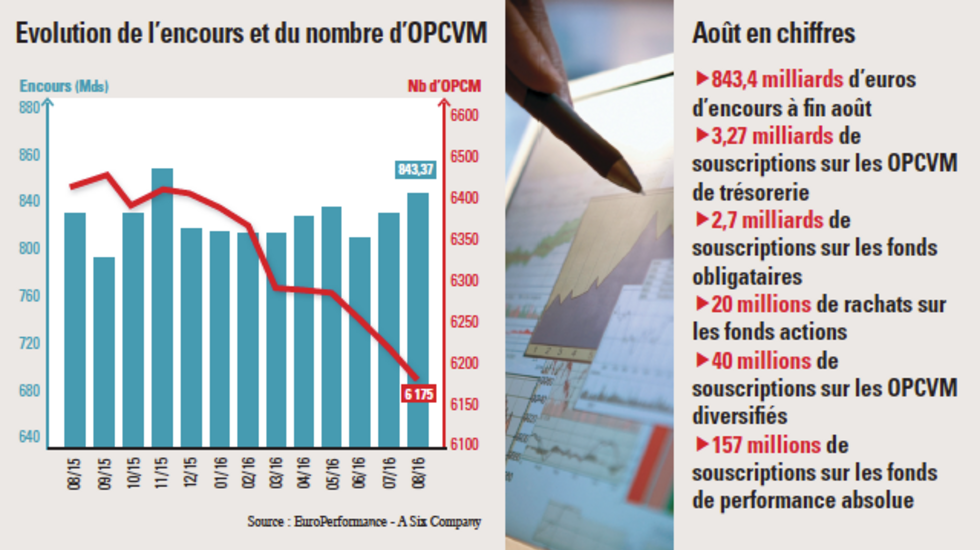 En août, le marché des fonds de droit français a enregistré une progression de 1 %, ce qui porte le niveau des encours à 843,4 milliards d’euros. Dans la catégorie des fonds de trésorerie, selon Six Financial Information, les investisseurs ont limité leurs investissements à 3,3 milliards d’euros, recherchant en priorité les portefeuilles les plus longs du segment. La collecte s’est donc concentrée sur les fonds de catégorie trésorerie, qui ont capté 4,4 milliards d’euros de flux, tandis que la catégorie trésorerie court terme a subi plus de 1 milliard d’euros de rachats.
