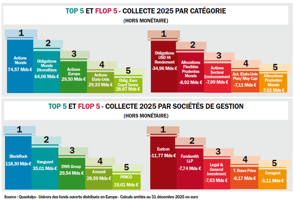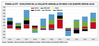 L’année 2025 marque une année exceptionnellement forte pour la collecte en Europe, avec + 507 Mds €, soit près du double de la moyenne historique sur 10 ans (+ 272 Mds €).