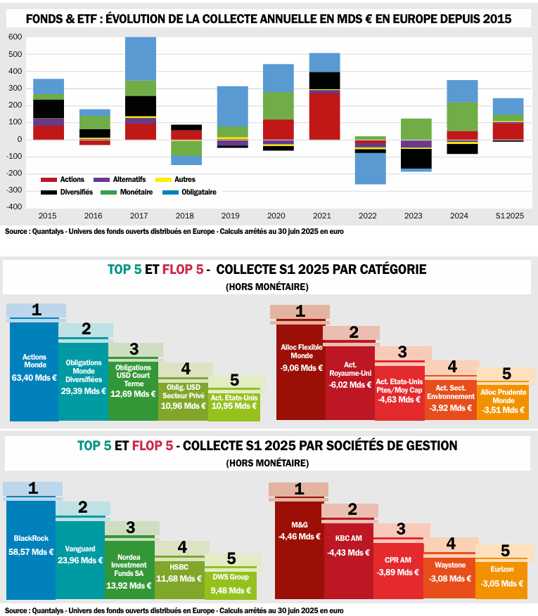 Avec + 234 Md€ de collecte nette lors du 1 semestre 2025, l’année se situe au-dessus de la moyenne décennale (+ 220 Md€) pour le moment, ce qui en fait un bon cru en valeur absolue pour la distribution de fonds en Europe.